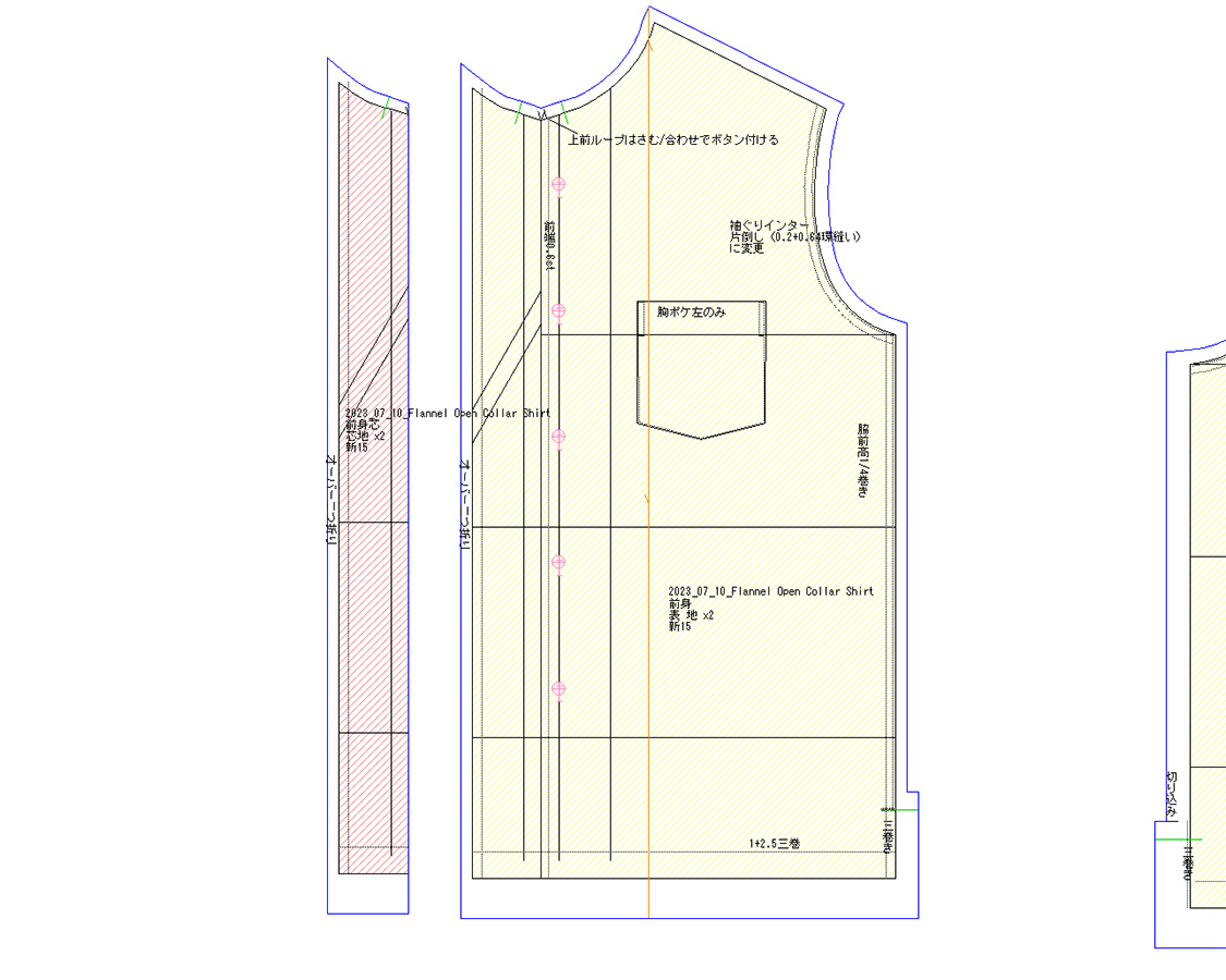 脇は巻縫い、お互いを噛みあうように折ってチェーンステッチで縫う。開きの位置は一部断ち切りがあります。