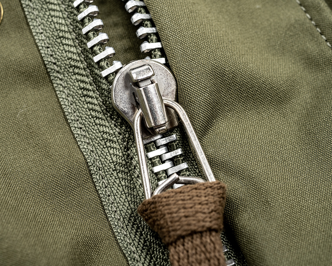 フロントの大型ファスナー。前はYKKも気合でこんなデザインを「オールドアメリカン」という名前作っていましたが、いつの間にか「シルバーはやめます」「この形は廃番です」と辞めたい感、満々になってしまったので今回は不採用。という事で、朝日ファスナーさんの大型ファスナーに、やはり朝日さんの力織機テープでプル。