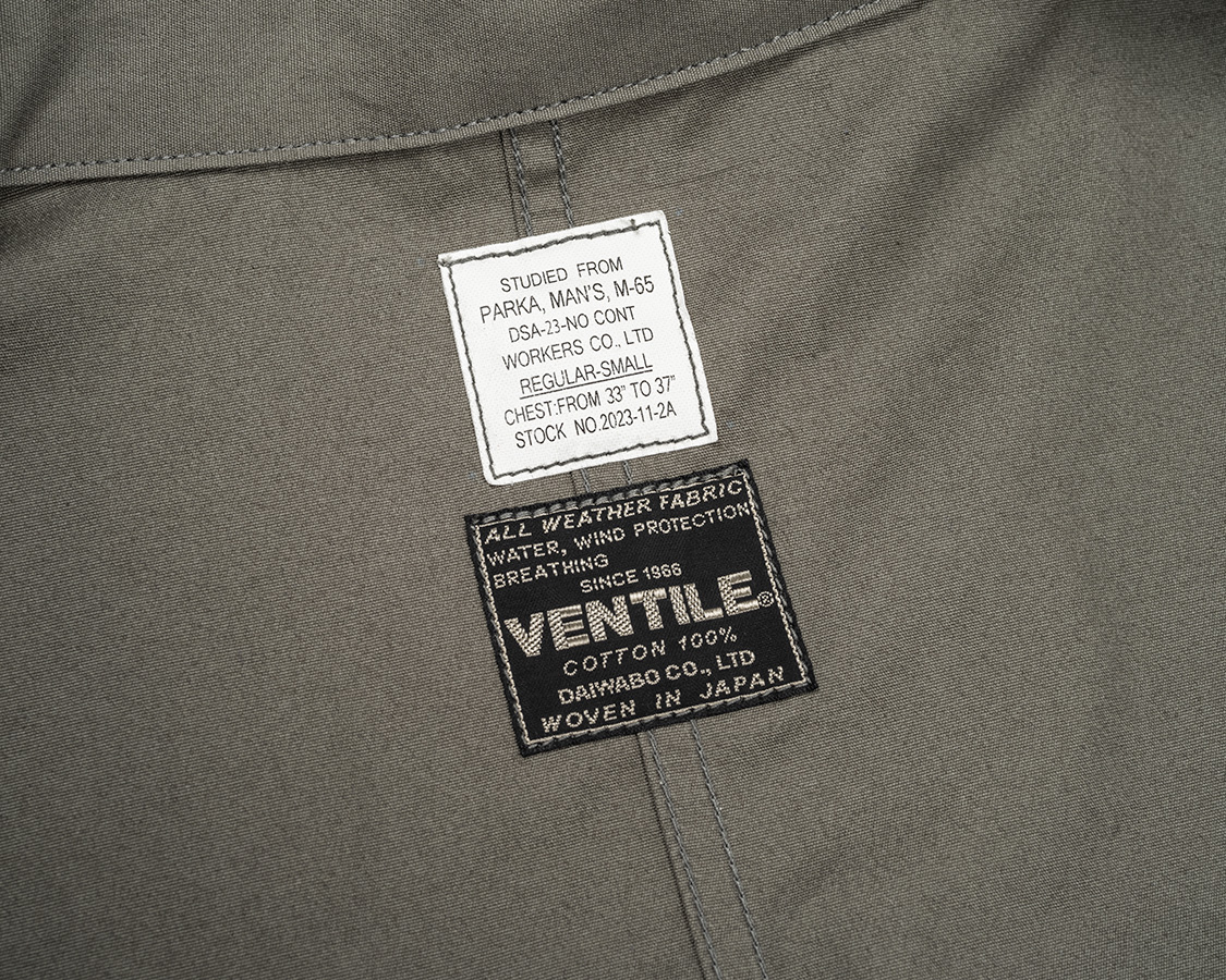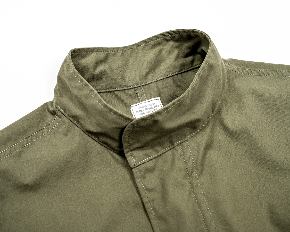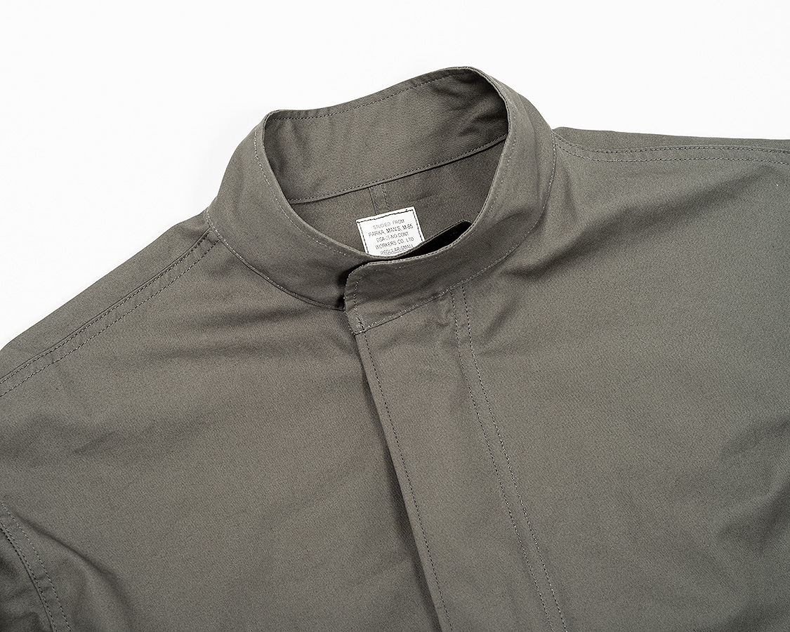 M-65、フィッシュテールの特徴。襟が台襟。ミリタリーでは着脱式のフードがつきますが、WORKERS版は割り切ってフードはつきません。というのも・・・
