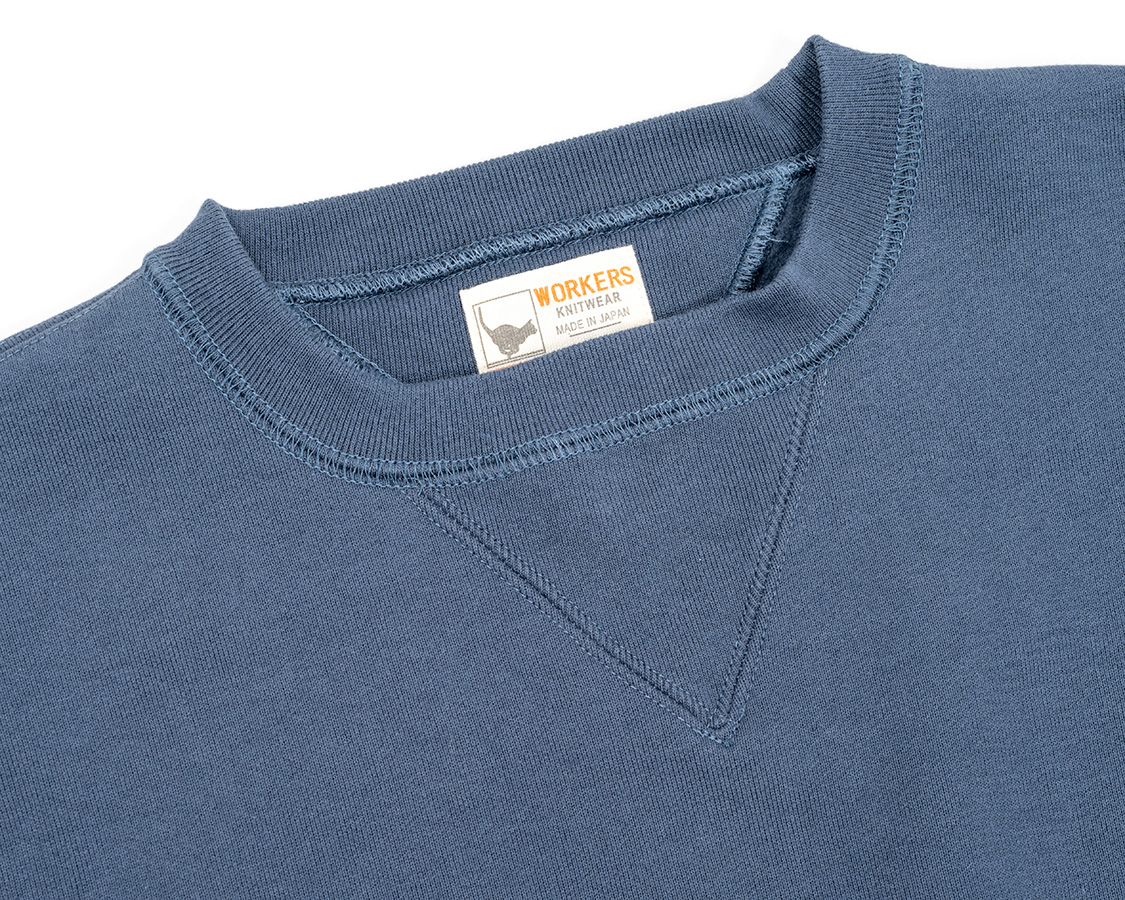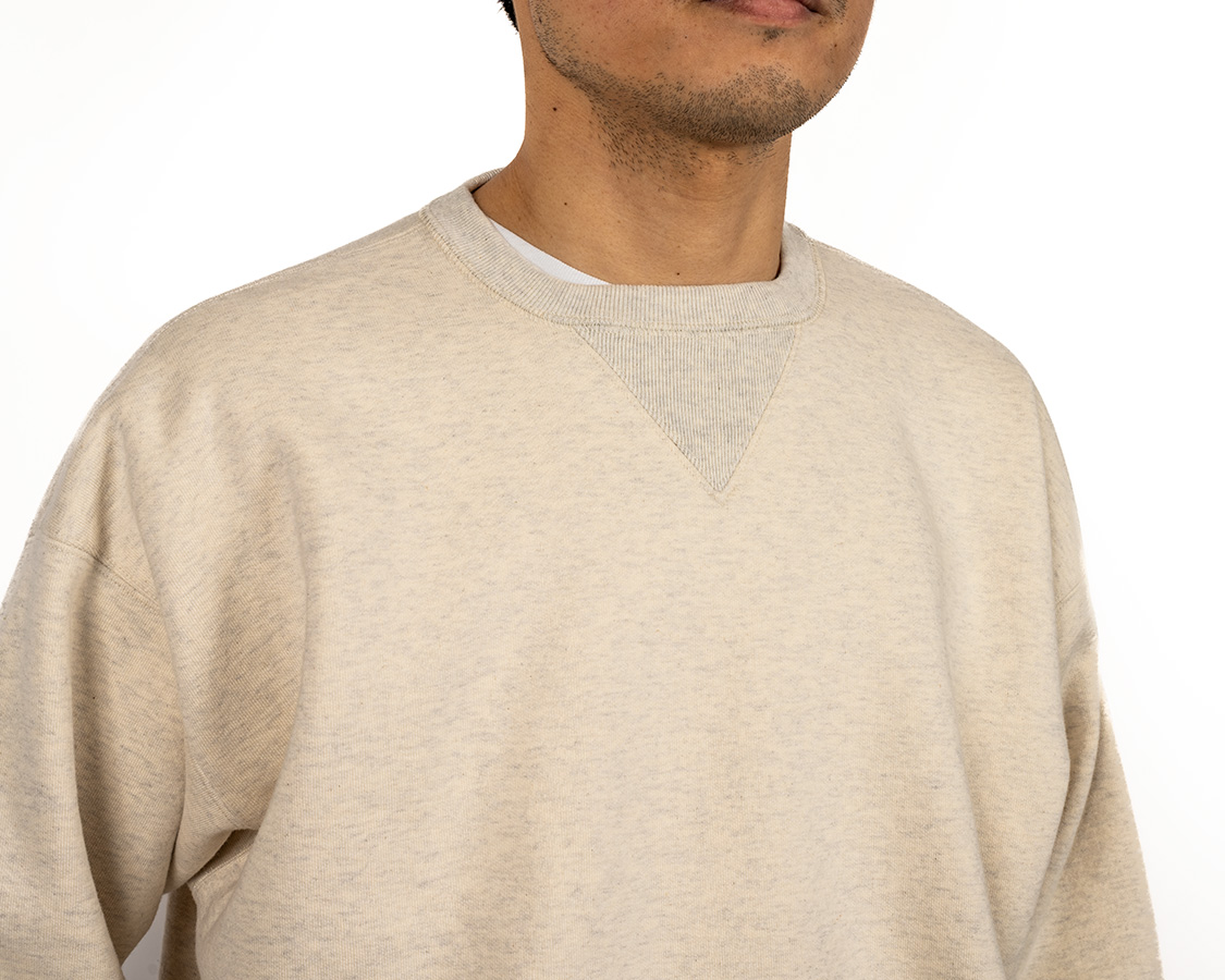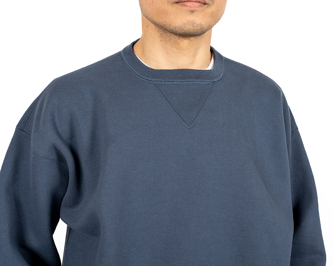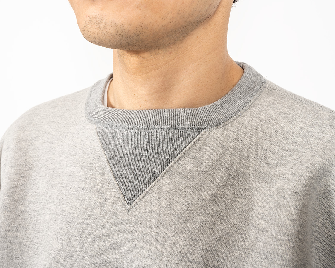 綿100%の裏毛(身頃に使っている)は伸び縮みが少ない。それに対し、リブは綿100でもある程度伸び縮みする。そこで、身頃の一部をカットしてリブで置き換えるのがこのVの意味。身頃では足らない「頭を通る時の伸び」が「V字のリブ」であれば実現できるので。
