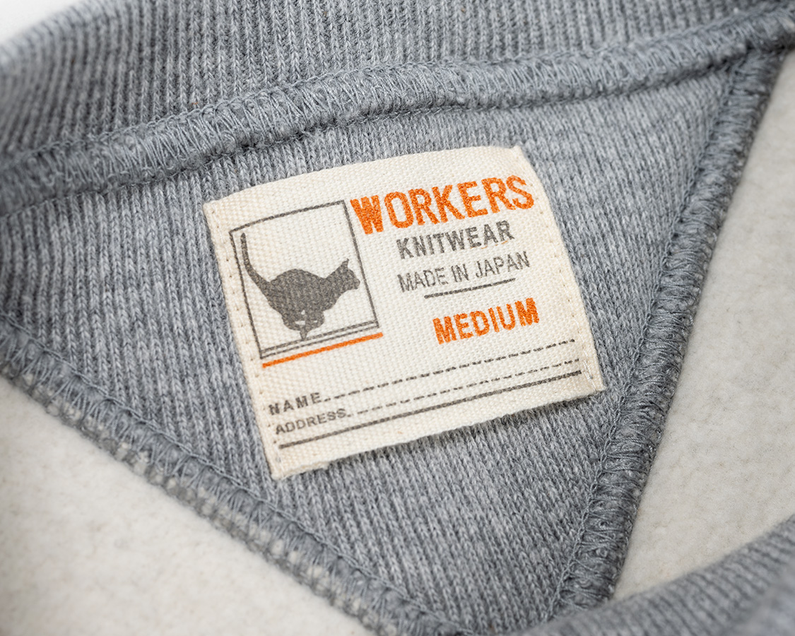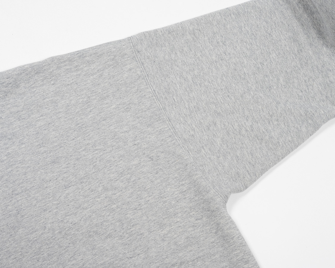 直線的なパターン。肩が落ち、直線的な袖付け。古いスウェットのパターンを参考にしつつ、めったにビンテージで出てこない「大きめサイズ」をパターンで再現しています。