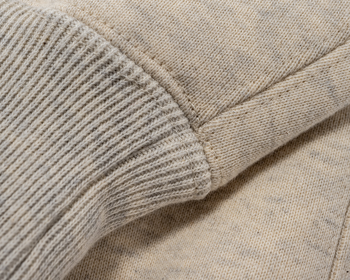 脇・袖口のリブ始末。ここは首回りと同じ、つないでから「マタギ」で始末するのですが、裏だけ振りミシン(ロック目)。表はダブルステッチ。