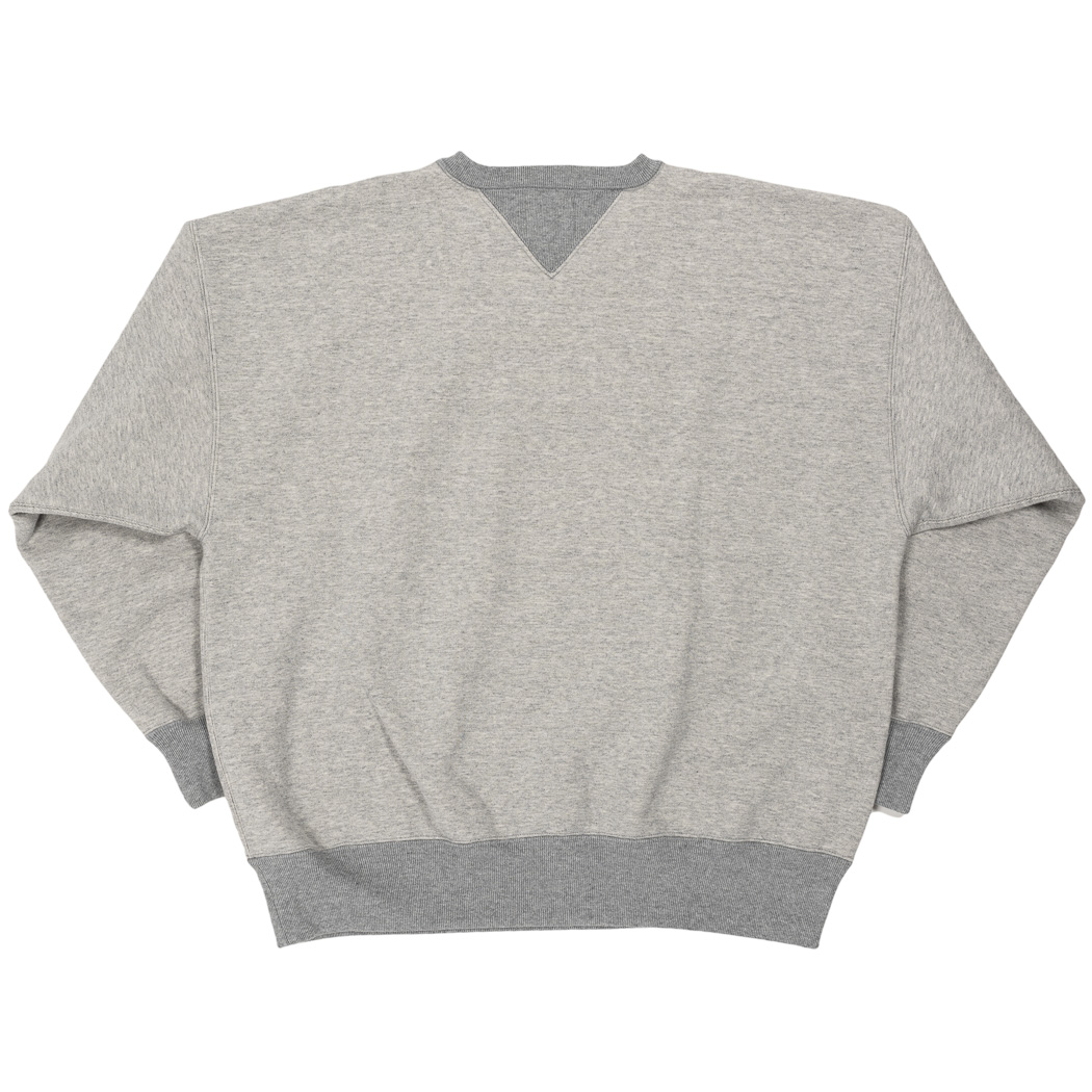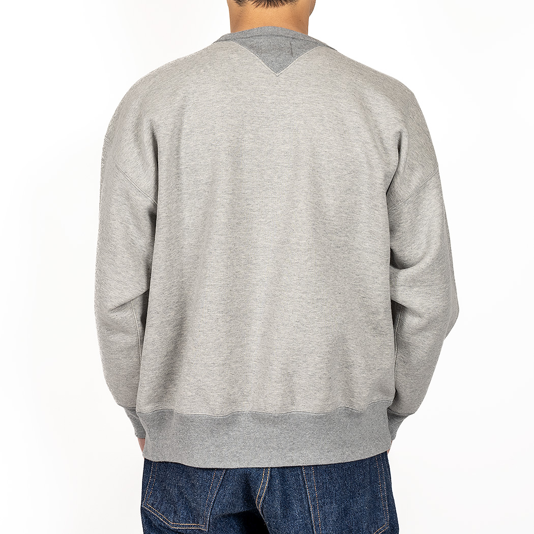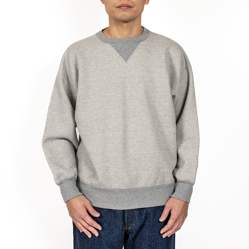 表30 番・中30 番・裏7 番で、裏の糸ループを短く編み、 さらに起毛をかけた本格的冬用スウェットです。18ゲージでガチガチに目を詰めて編んでいるので形崩れしにくい。重さ15 オンス程あり、いわゆる「超ヘビーウェイトスウェット」 でも化繊は使っていないのでしなやか。