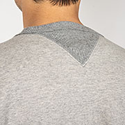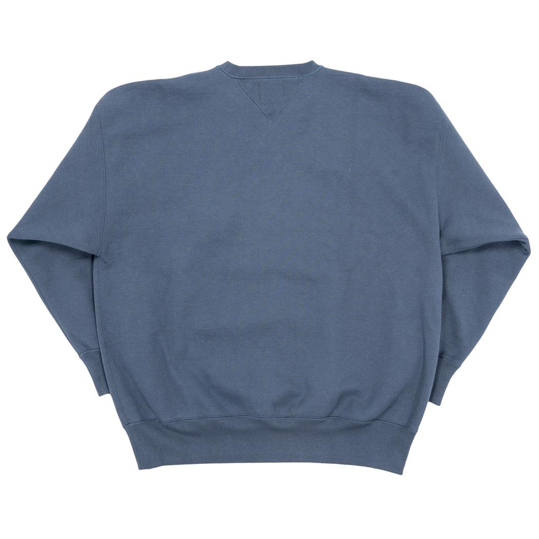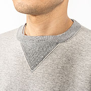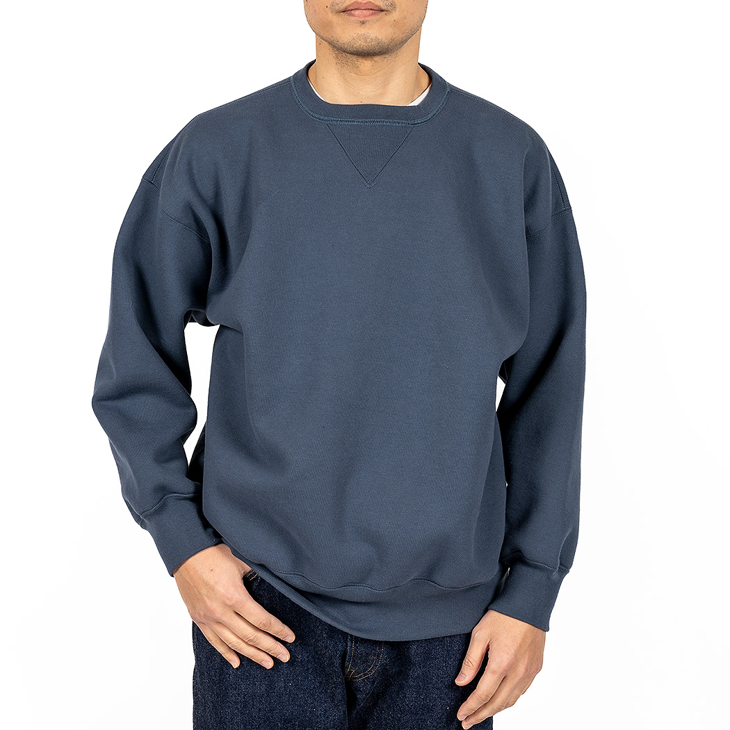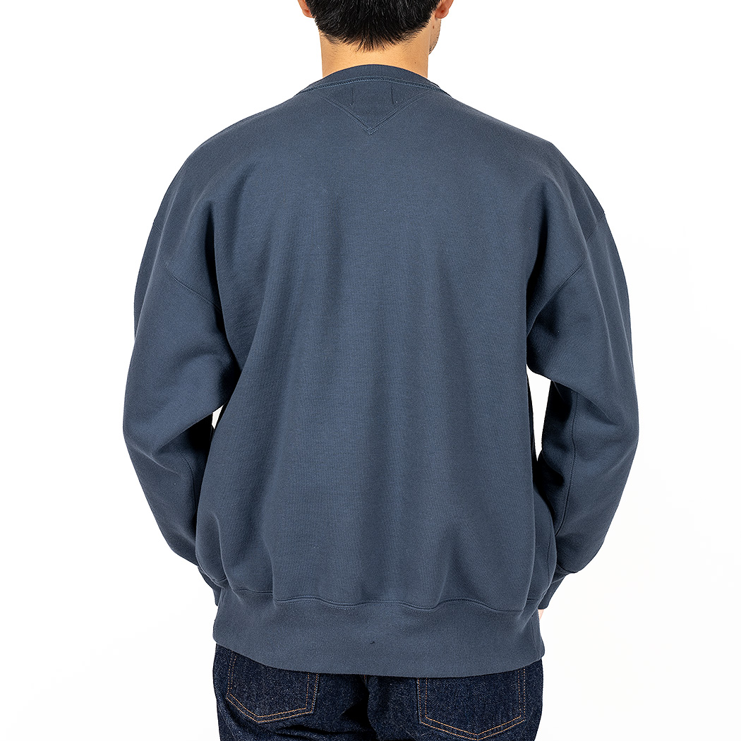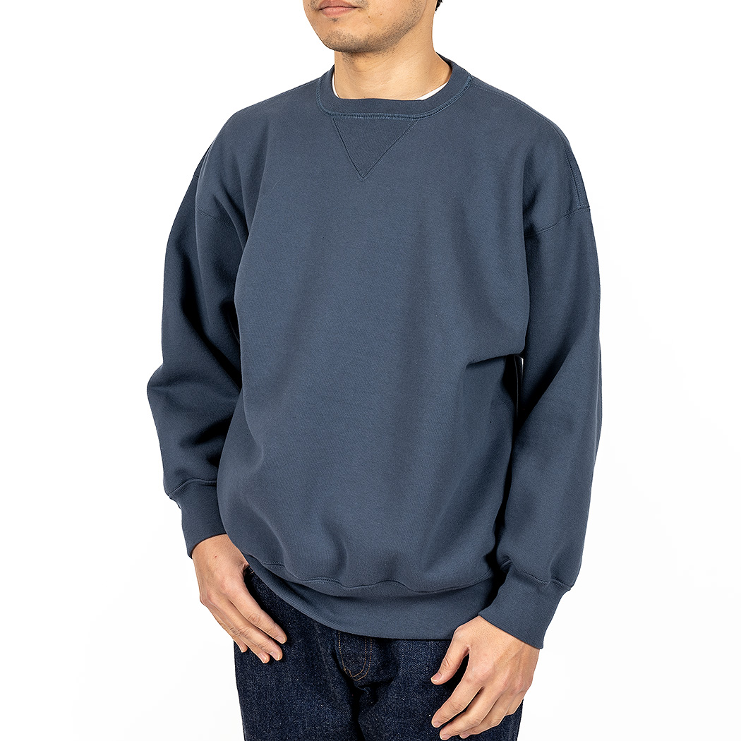 表30 番・中30 番・裏7 番で、裏の糸ループを短く編み、 さらに起毛をかけた本格的冬用スウェットです。18ゲージでガチガチに目を詰めて編んでいるので形崩れしにくい。重さ15 オンス程あり、いわゆる「超ヘビーウェイトスウェット」 でも化繊は使っていないのでしなやか。