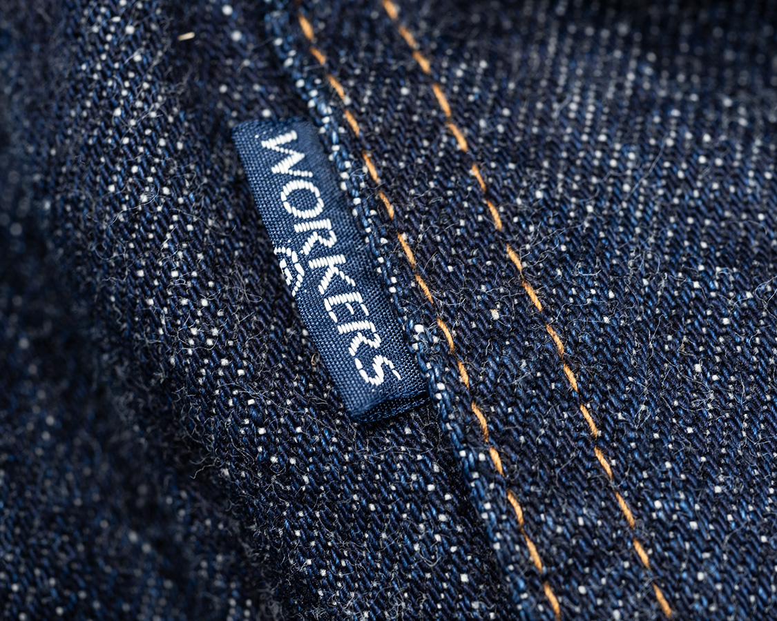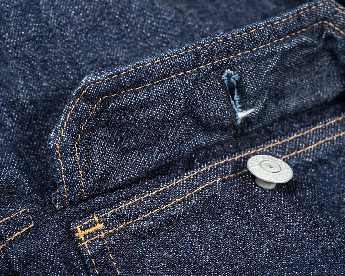 フラップ、表・裏に縮率があるので端がくるっと丸まります。現代なら絶対にNGな部分にも良さを感じるのが「レプリカジーンズ」的な製品の面白いところ。 |