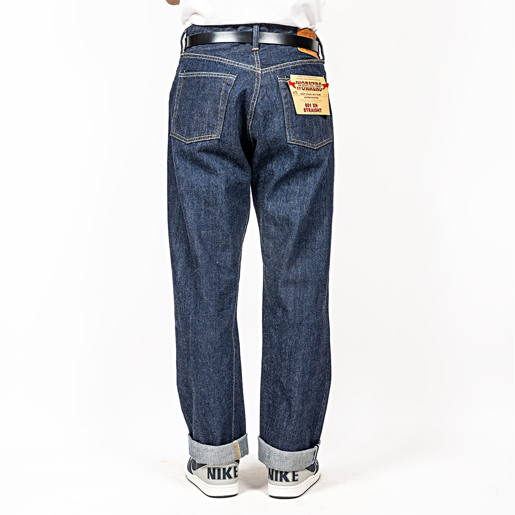 仕様はいわゆる大戦モデルを取り入れ、脇のクインチ(倒しステッチ)が長い。コインポケット、リベット無し。ポケットスレキはヘリンボン生地。大戦というとネルの袋布も有名ですが、通年穿くことを考えヘリンボンを選びました。革パッチは通常801が牛革のところ、801XHは鹿。