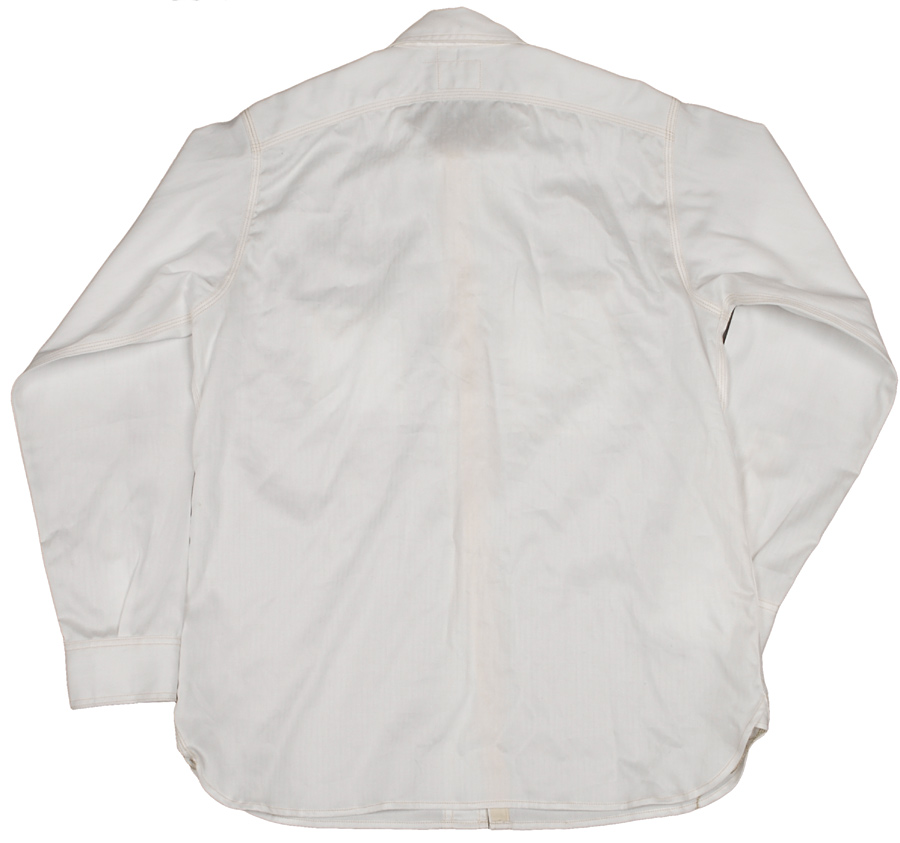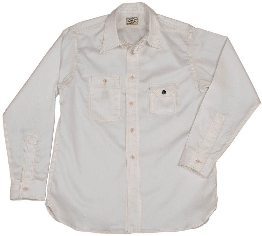 同じワークシャツでも、色合いが変わるとぐっとドレスシャツ的な雰囲気を醸し出しています。