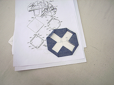 実際に、上がり型を入れて折り、その型を抜いたのが下の写真です。さらに、それを半分に折り、フラップの形になりました。